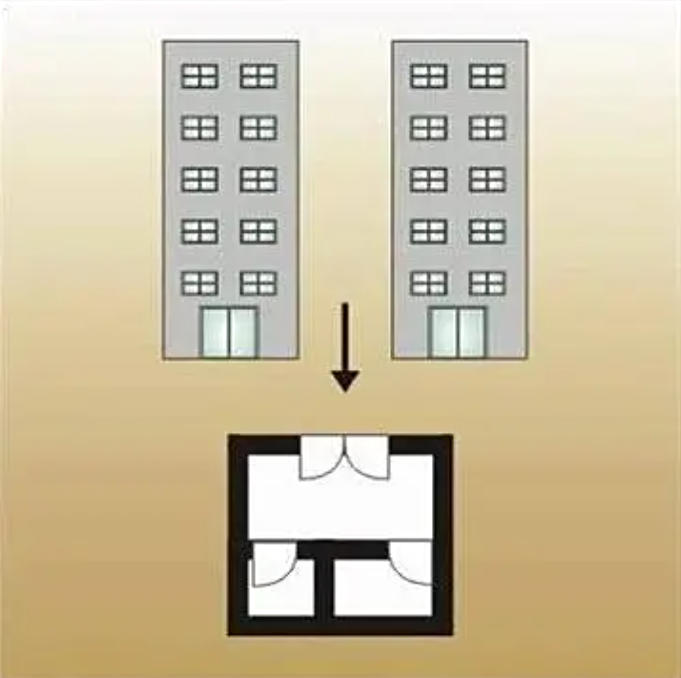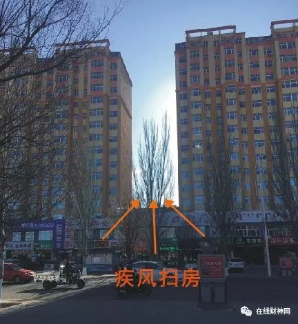 第二种类型如图二所示,房子被对面不远处有两栋比较高大的建筑,相距比较近,在缝隙处形成疾风吹袭的格局,尤其门、窗户、阳台朝向风口处危害更甚,此类格局也被称作天斩煞(天堑煞)。