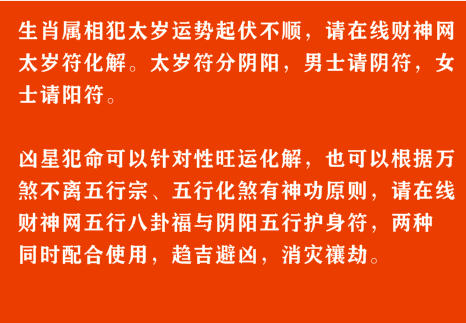 限于篇幅限制,其他凶星犯命情况就不展开介绍了,需要了解可以加微信联系。这里介绍一下,朱雀、岁破、大耗等凶星,也可以请在线财神网五行八卦福与阴阳五行护身符化解转运,方法如下:
