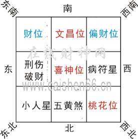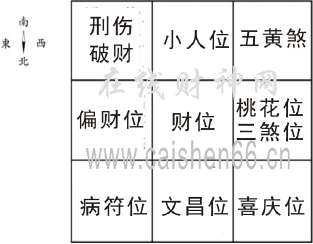图中的桃花位是一白贪狼星流年飞临的方位:这颗星专管事业,人缘与桃花,五行属水,吉。