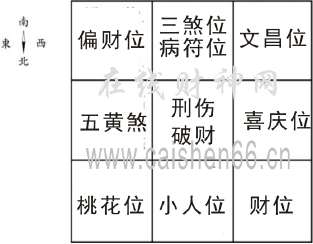 图中的刑伤破财位是七赤破军星流年飞临的方位:这颗星会引起盗贼觊觎,小人陷害。五行属金,凶。