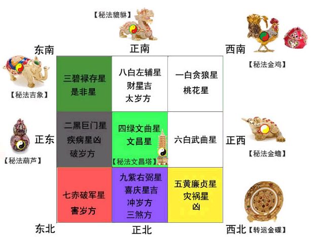 前文已经说了一白桃花位五行属水,二黑病符、五黄、八白财位都五行属土,三碧小人位、四绿文昌都是五行属木,六白偏财位、七赤刑伤五行都属金。