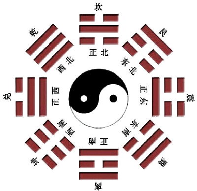 “易有太极”,以圆象征太极,代表天地未分时的浑沌状态。之后,宇宙间各类物质都找到了自己的位置,天地开始分明,“是生两仪”,有阴有阳,故用两个黑白鱼形表示。“两仪生四象,四象生八卦”,明·来知德将太极图配以先天八卦和后天八卦,以说明之,见下图;