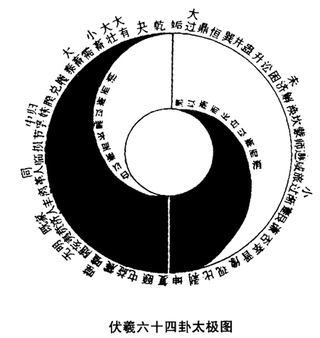 外圈环布的是前面我们介绍的《伏羲六十四卦圆图》。黑中的白路指向《复》,阳气由此而生,“白以渐而长,黑以渐而消”,《复》 —《临》 —《泰》 —《大壮》 —《夬》 —《乾》,阳从下渐长,阳则渐消,至《乾》则阳盛极。白中的黑路指向《姤》,阴气由此而生,《姤》 —《遁》 —《否》 —《观》 —《剥》 —《坤》,“黑以渐而长,白以渐而消”,阴在下浸阳,至《坤》为全阴。此图说明,太极图完全体现了六十四卦阴阳消长之理,阐明了性命造化之道。来知德说,得到此图“便就知进知退,知存知亡,便即‘与天地合其德,日月合其明,四时合其序,鬼神合其吉凶’。”