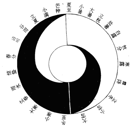 明·来知德在《易经来注图解》中,将太极图配以日象,称“一日气象图”;又将太极图配以二十四节气,叫“一年气象图”,见下图。